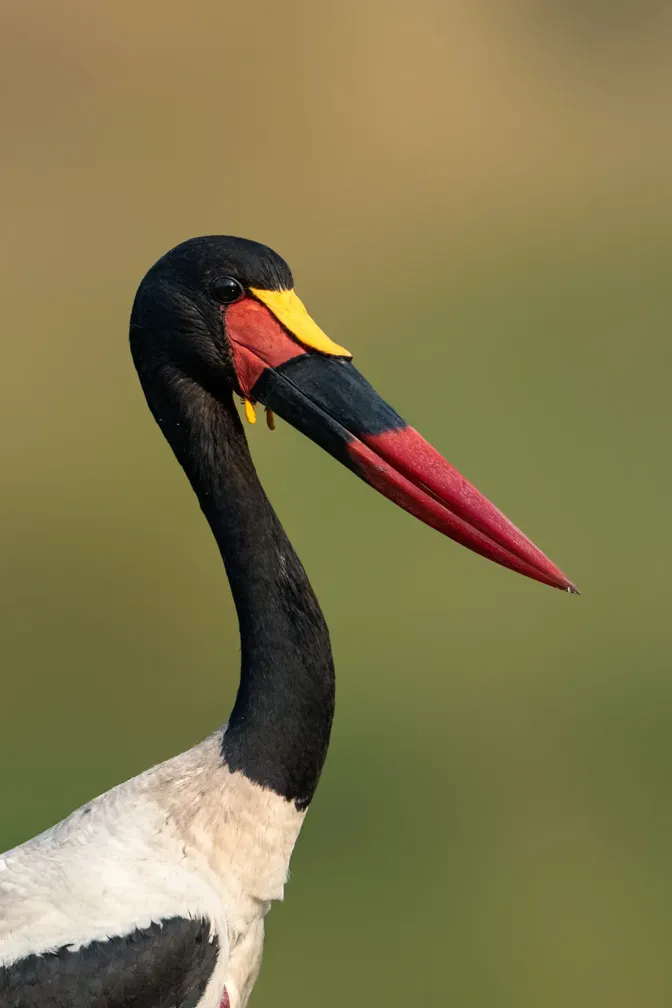 The Saddle-Billed Stork searches for prey by stabbing its bill into water, mud, or vegetation and catching prey by contact. This side profile of the bird was taken while it was hunting for food in the Okavango Delta in Botswana.