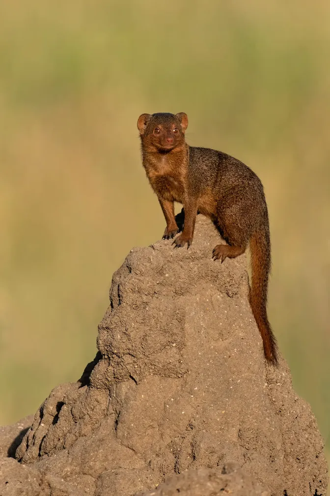 A favourite spot of the Common Dwarf Mongoose is on the top of termite mounds. This helps them get a vantage position over their surroundings as well as provides them with their favourite termites and ants. I was visiting Tarangire National Park in Tanzania when we encountered this beautiful mongoose sitting atop one such mound. The shades of brown seem to pop in the sunlight.