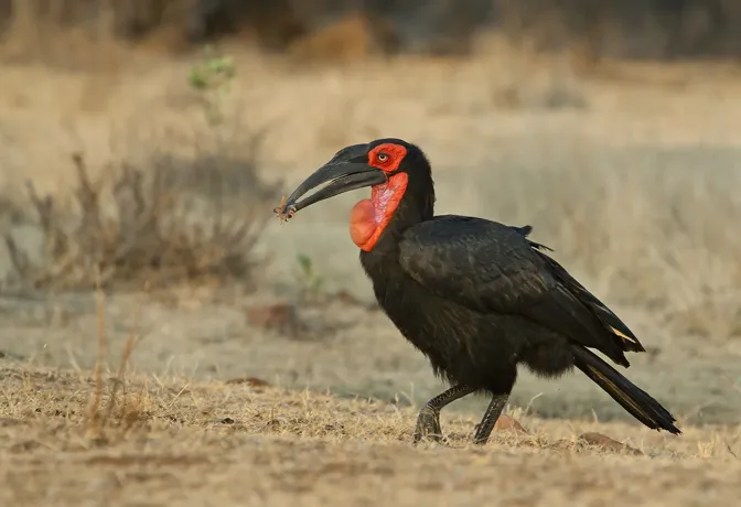 This Southern Ground Hornbill was photographed in the Okavango Delta in 2018. He was out with his group hunting and happened to catch something. I clicked this photo just before he swallowed it whole.