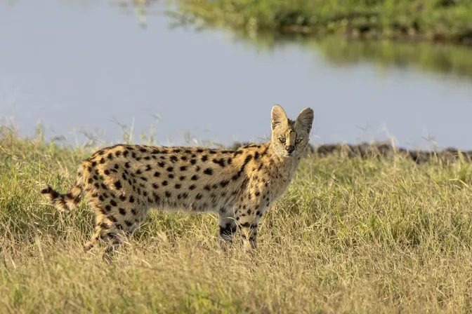 This photo of a Serval was photographed in Amboseli in 2015. The Serval was out looking for prey and upon seeing us, stopped for a moment to meet our gaze head on. After a few seconds, the Serval decided that we were harmless and decided to go on its way.