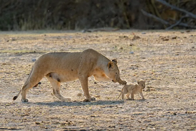 This photo was taken in Amboseli National Park in 2022. We could see a herd of African elephants deep in a bamboo thicket sounding alarmed. Wanting to see what was happening, we stopped our vehicle and waited. Soon this lioness emerged with a cub. She was in the process of moving her cubs when the herd of elephants appeared in the vicinity. This particular cub did not want to be carried. The cub kept trying to run and finally, after this gentle yet stern pat from its mother’s paw, the cub relented and was carried to safety. Watching this rare interaction was a highlight of my trip.
