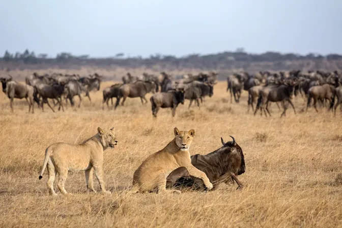 This photo was taken in Masai Mara in 2016. The pride had ambushed and successfully brought down this Wildebeest but because there were some young sub-adult cubs in the pride, they were allowed to finish the hunt. It was incredible to watch this learning moment. As you can see, the cubs seem to be a bit unsure about what is to be done next.
