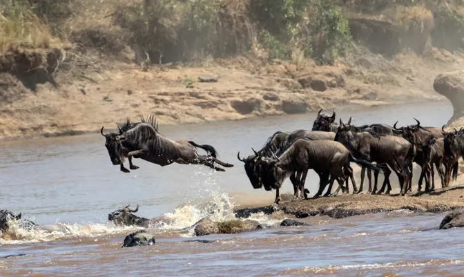 This photo was taken during the Great Migration of 2016 in Masai Mara. A herd of Wildebeest and Zebra were trying to cross the Mara River. To avoid the hungry Nile crocodiles that swarmed the river, some of the Wildebeest chose to leap high into the water and get to the other side. I was lucky enough to experience this and also click a picture.