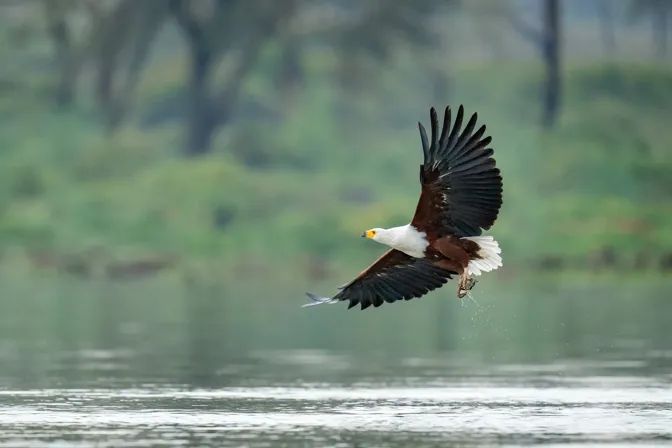 African Fish Eagles feed mainly on fish. When it hunts, it swoops down from a perch in a tree, snatching the prey from the water with its large, clawed talons. The eagle then flies back to its perch to eat its catch. This photograph of an African Fish Eagle with its prey was taken in Kenya’s Lake Naivasha in 2022.