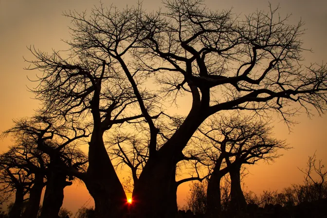 This photograph of the sun rising between the branches of a Baobab tree was taken in Botswana in 2018. The silhouette provided by the dry branches makes for a dramatic picture.