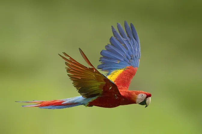 This large macaw species showcases a brilliant mix of red, blue, and yellow feathers, with a striking white face adorned with facial patches of bare skin. Its long, strong beak is designed for cracking nuts and seeds, while its powerful wings enable it to soar through the forest canopy with grace and agility. Scarlet Macaws are highly social and form monogamous pairs, often seen flying and foraging together. They have a wide repertoire of vocalizations, including squawks, screams, and melodic calls, which they use for communication and establishing territory.