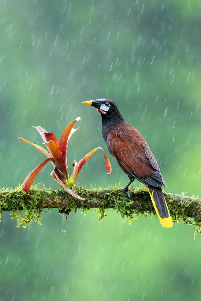 These large, black-colored birds possess a unique appearance, with a long, pendulous tail, bright yellow tail coverts, and a bright red throat patch. Their calls are unmistakable, consisting of a cascading series of deep, resonant gurgles and metallic notes. During rain showers, the Montezuma Oropendolas exhibit fascinating behavior. They gather in large, noisy colonies, creating a chorus of calls and displaying their pendulous nests, woven with meticulous precision from vines and palm fibers. These nests, suspended from tree branches, are a remarkable sight against the backdrop of falling rain.