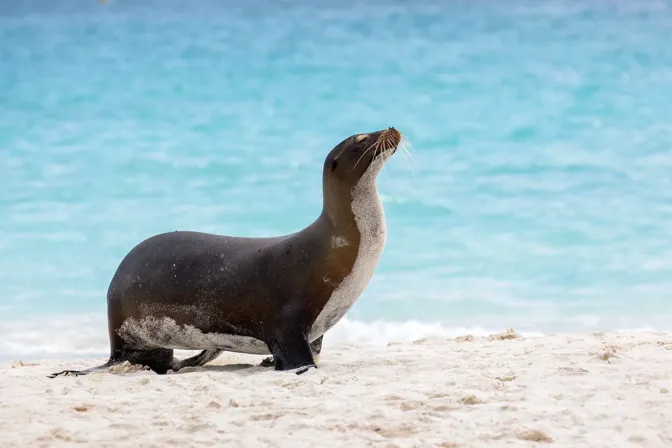 Galapagos Sea Lions primarily feed on a diet of fish and squid, foraging in the rich waters surrounding the islands. These sea lions are highly social animals, often seen in large colonies on beaches and rocky shorelines of the Galapagos Islands. They are known for their playful and curious nature, and they frequently engage in activities like swimming, surfing in the waves, and even approaching snorkelers and divers. Their vocalizations, which include barks and grunts, are commonly heard on the islands. They are excellent swimmers and divers, capable of hunting at various depths.