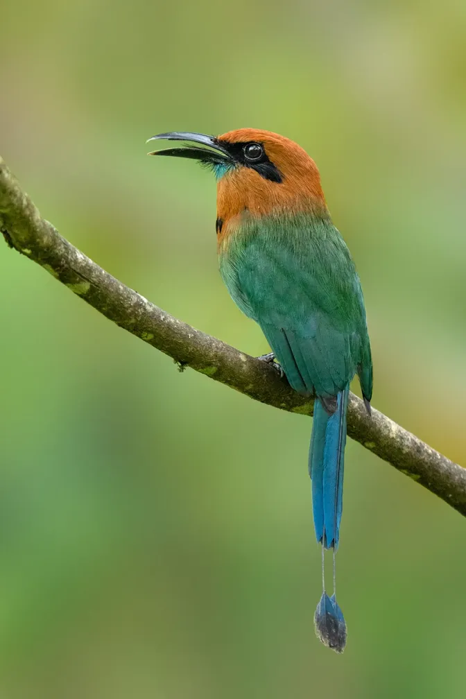 The broad-billed motmot is one of the smallest members of the family and is very sedentary. As its name suggests, the broad-billed motmot has a broad, flattened bill. Its bill is black, and has serrated edges. These birds are non-migratory. This species does not demonstrate sexual dimorphism, which means that both the male and female look alike. This species does not demonstrate sexual dimorphism, which means that both the male and female look alike.