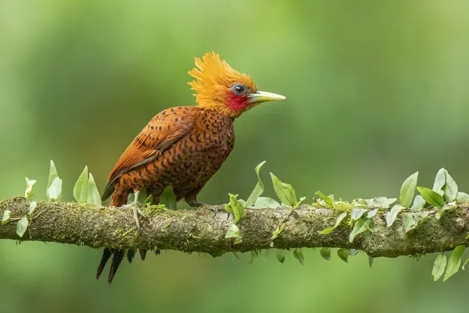 The Chestnut-coloured Woodpecker, scientifically known as Celeus castaneus, is a striking bird species found in the forests of Central and South America. With its vibrant plumage and unique adaptations, the Chestnut-coloured Woodpecker stands out among its avian counterparts. As its name suggests, this woodpecker showcases a rich chestnut-brown coloration on its back, head, and wings, while its underparts feature a contrasting creamy white or buff hue. It possesses a sturdy bill, ideal for drumming on tree trunks to excavate insect larvae and create nesting cavities. However, habitat loss, deforestation, and fragmentation pose significant threats to the Chestnut-coloured Woodpecker's survival. Conservation efforts that focus on protecting their forest habitats and promoting sustainable forestry practices are vital for ensuring the continued existence of this charismatic and ecologically important species.