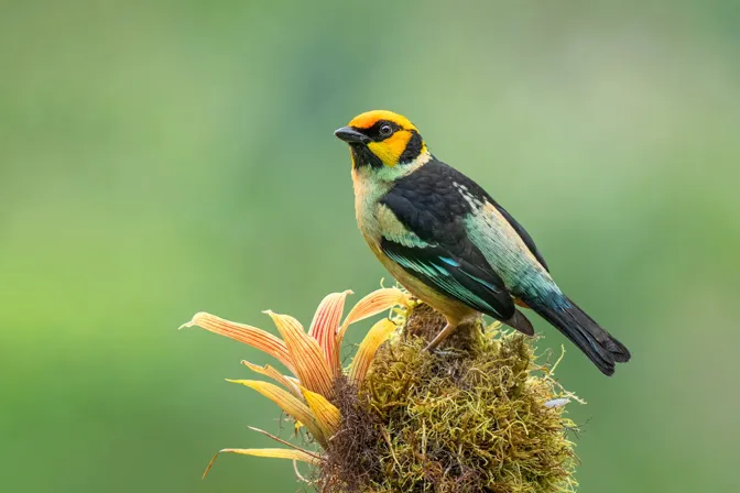 The Flame-faced Tanager, scientifically known as Tangara parzudakii, is a stunning bird species found in the cloud forests of the Andes Mountains in South America. With its vibrant plumage and distinctive facial markings, the Flame-faced Tanager is a true spectacle of nature. Flame-faced Tanagers inhabit the canopy and mid-levels of the cloud forests, where they flit among the foliage in search of food and nesting sites. Their vocalizations consist of melodic songs and calls that contribute to the soundscape of the forest. Conservation efforts focused on protecting their cloud forest habitats and combatting deforestation are crucial for the survival of the Flame-faced Tanager. By preserving their natural environments and promoting sustainable land management practices, we can help ensure the continued presence of this stunning tanager species in the Andean regions.