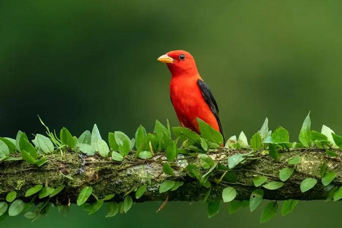 Adult males sport a striking scarlet-red body with contrasting black wings and tail. In contrast, females and immature males exhibit an olive-green coloration, allowing them to blend seamlessly with the foliage. The Scarlet Tanager's appearance is particularly striking against the backdrop of green forests, making it a sought-after sighting for birdwatchers and nature enthusiasts.
