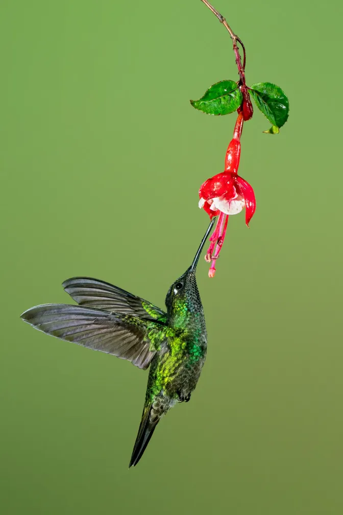 Rivoli's Hummingbird is a large hummingbird found primarily in the highlands of Mexico and parts of Central America. It showcases a captivating mix of iridescent colors, with the male displaying a deep green head and upperparts, a vibrant purple gorget (throat), and a dark blue belly. The female, though less flashy, still exhibits beautiful green and blue feathers.