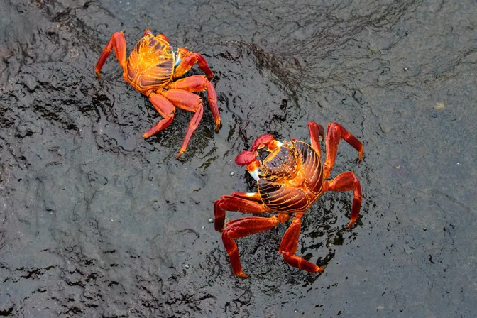 Sally Lightfoot crabs are brightly-coloured coastal scavengers, found in the Galapagos Islands and across the western coast of South and Central America. They have an extremely generalist diet, feeding on anything from sea lion placenta to other crabs. This makes them an important part of the ecosystem, as they provide services such as keeping the shore clean of any organic debris and eating ticks off marine iguanas. They are rumoured to have been named after a Caribbean dancer, due to their agility in jumping from rock to rock, their ability to run in four directions and their capacity to climb up vertical slopes. This extreme agility makes them very difficult to catch. Adult crabs show characteristic intense blue and red colouring on their shells, with a white or pale blue underbelly.