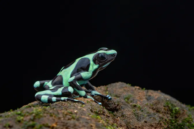These frogs are relatively small, typically ranging from 2 to 5 centimeters (about 0.8 to 2 inches) in length. They have a bright green or yellow-green coloration with contrasting black stripes, spots, or patterns covering their bodies. This coloration serves as a warning to potential predators that they are toxic. The toxic secretions of Green and Black Poison Dart Frogs are a result of their diet in the wild, which includes consuming certain ants and mites containing toxic alkaloids. In captivity, where their diet changes, they typically lose their toxicity over time.