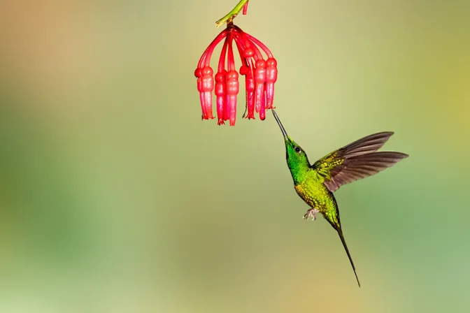 The Empress Brilliant Hummingbird is named for its regal appearance. The male has a deep, shimmering emerald green plumage on its upperparts, with a vibrant purple throat and breast. The female is slightly less colorful, with a greenish-bronze upperparts and a pale throat and breast. These hummingbirds primarily feed on nectar from a variety of flowering plants. They have a long, curved bill and a specialized tongue that allow them to extract nectar from deep within the flowers. They are also known to consume small insects and spiders for additional protein.