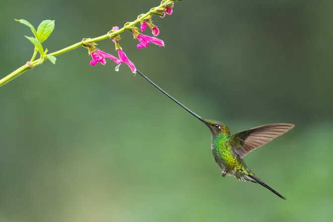 The most distinctive feature of the Sword-billed Hummingbird is its exceptionally long bill, which is longer than its body. This remarkable adaptation allows it to reach nectar from deep within tubular flowers that other hummingbirds cannot access. To compensate for the bill's length, the bird has developed shorter wings, making it less maneuverable in flight. Despite its specialized bill, the Sword-billed Hummingbird faces challenges in obtaining nectar due to its weight and size. It often perches rather than hovers while feeding, using its feet to stabilize itself. Additionally, it feeds on insects and spiders for additional protein in its diet.