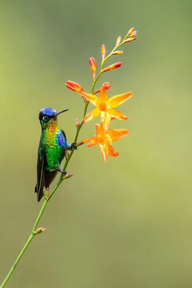 This small hummingbird species exhibits a combination of iridescent colors. It has a shimmering emerald-green body, with a bright purple-blue crown and a deeply forked tail. However, its most captivating feature is its fiery-red throat, which extends into a narrow band of greenish-blue feathers. Fiery-throated Hummingbirds primarily feed on nectar from a variety of flowering plants, using their long, slender bills and specialized tongues to extract the sweet nectar. They also consume small insects and spiders as a source of protein.