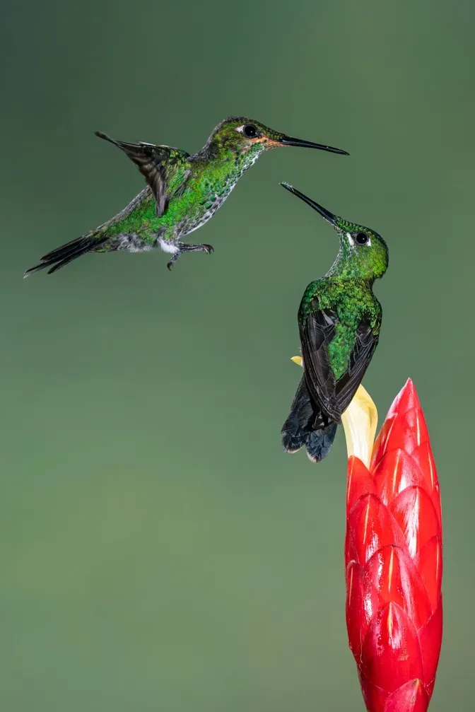 The green-crowned brilliant usually forages in the middle and upper strata of the forest. A primary source of nectar is Marcgravia vines, and females also feed at small understory plants. Males sometimes defend Marcgravia patches, though they also nectar by trap-lining, visiting a circuit of flowering plants. The species usually clings to flowers to feed rather than hovering. Humming Birds with wings that flap up to 90 times per second and heart rates exceeding 1,200 beats per minute. They depend on calorie-rich nectar for fuel. They can easily consume their own body weight in the stuff each day; one study described a 3-gram hummingbird drinking 43 grams of sugar water in one day, a full 14 times its body weight.