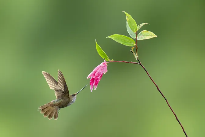 The Bronzy Inca Hummingbird has a distinctive appearance, with deep metallic bronze-green feathers on its upperparts and a shimmering golden-green throat and chest. The male's iridescent colors can vary depending on the light, creating a captivating display. Females, on the other hand, have similar coloration but with less pronounced iridescence. These hummingbirds inhabit montane forests and cloud forests at higher elevations. They primarily feed on nectar from a variety of flowering plants using their long, slender bills. They are important pollinators, transferring pollen from flower to flower as they feed.