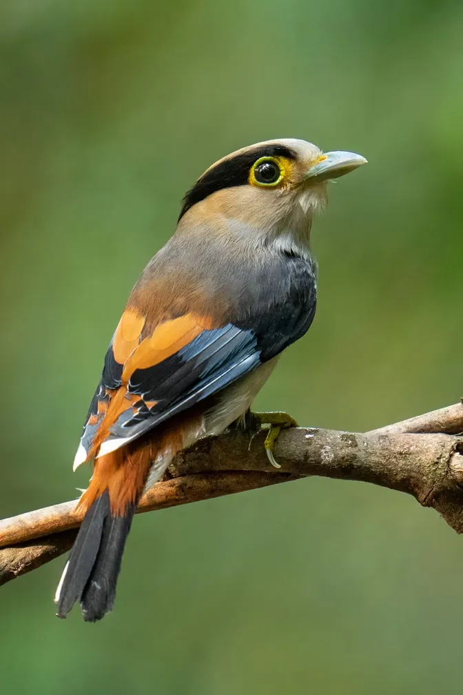 The Silver-Breasted Broadbill is found across South-East Asia in tropical and sub-tropical moist lowland and montane regions. It feeds on insects and invertebrates such as land snails, mantises, grasshoppers, caterpillars, etc. This is a small bird with a distinctly silky, smooth-feathered appearance. It has a warm soft brown upper body with a black crescent above the eye and a glossy blue patch on the dark wings.