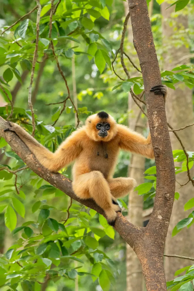 This female Yellow-Cheeked Gibbon was photographed in Vietnam’s Cat Tien National Park in 2023. Being arboreal (living on trees), her long arms help her swing through branches. Here she can be seen showing off her dexterity as she uses her arms to balance on top of a tree.