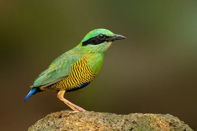 The Bar-Bellied Pitta is found in the seasonal tropical forests of Cambodia, Laos, Vietnam, and Thailand. The main identifier is the horizontal bars on the bird’s belly. Males have a green crown and a very distinctive black band from the eyes to the nape. In females, the head and neck are brown.