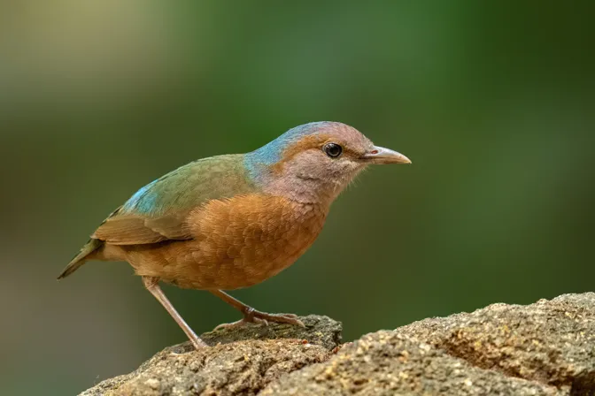 The Blue-Rumped Pitta is a shy, earthen-toned ground bird with a rotund, barrel-chested appearance. Both sexes are brown overall with a mossy green back and electric powder-blue nape. However, the female has slightly duller colours.