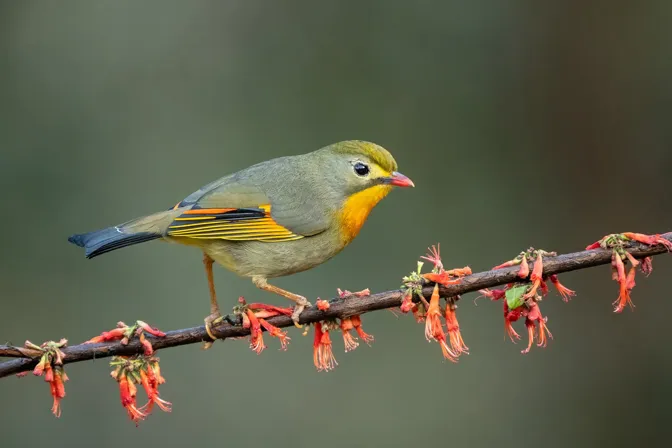 The Red-Billed Leiothrix is native to southern China and the Himalayas. It is very secretive and tends to fly only in open habitats. The Red-Billed Leiothrix is known for its musical singing ability.