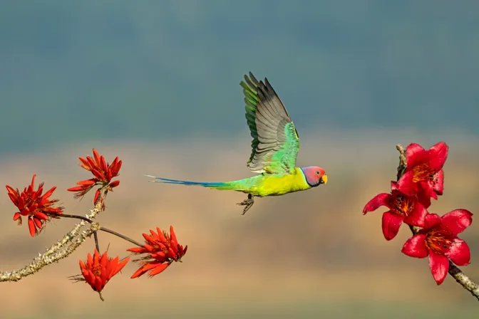 I was able to get this photo of a male Plum-Headed Parakeet while it was in the process of flying from one tree to another. The entire forest was colourful since it was the flowering season. Here you can see flowers from two species of trees – Flame of the Forest on the left and Silk Cotton Tree on the right.