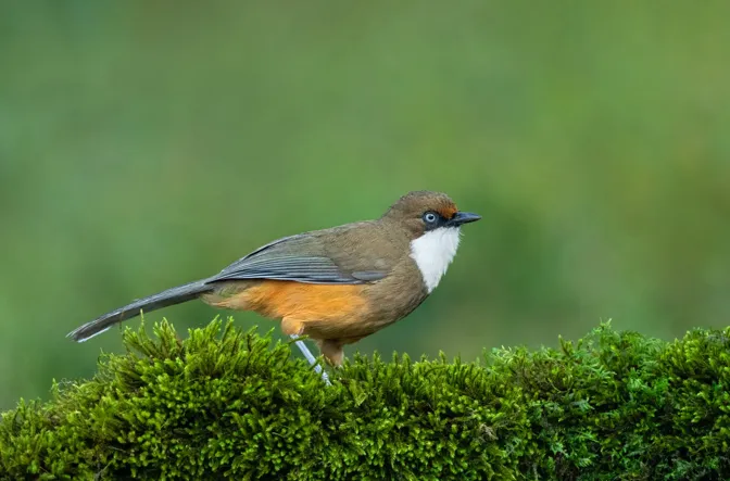 In this photo, one can very clearly see the white throat. The contrast of the brown, orange, and white of the bird on the rich green moss-grown branch adds to the beauty of the frame.