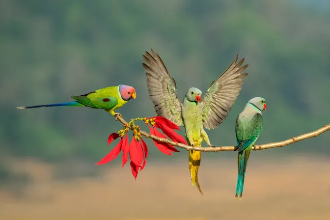 This photo was taken in the Western Ghats. Parakeets of different species were congregating in one spot. Here, a male Plum-Headed Parakeet (left) joins two Malabar Parakeets on a branch.
