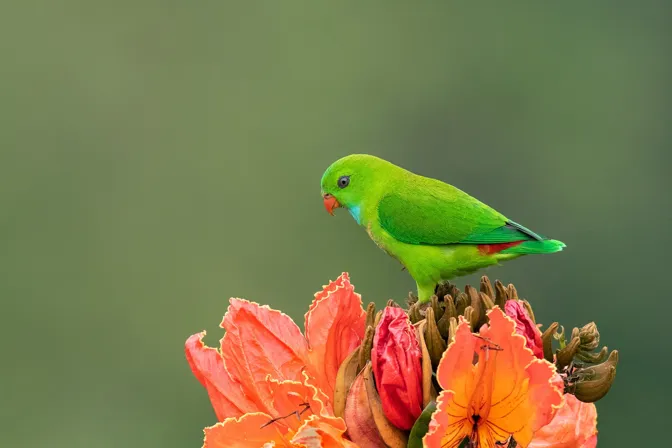 The adult Vernal Hanging Parrot is only 14 cm (5.5 inches) in length.