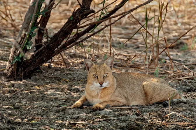 In this photograph, a large Jungle Cat can be seen resting in the shade under a thorny shrub. I clicked this picture in January 2012 in Velavadar National Park, Gujarat.