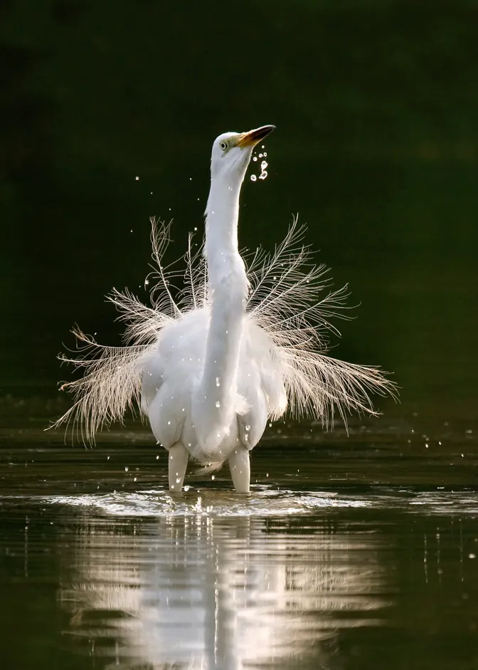 This image shows the delicate beauty of the breeding plumage of the bird, especially in backlit conditions. The Egret had flown down to the Cauvery River to quench its thirst. The falling droplets of water look like glowing pearls.