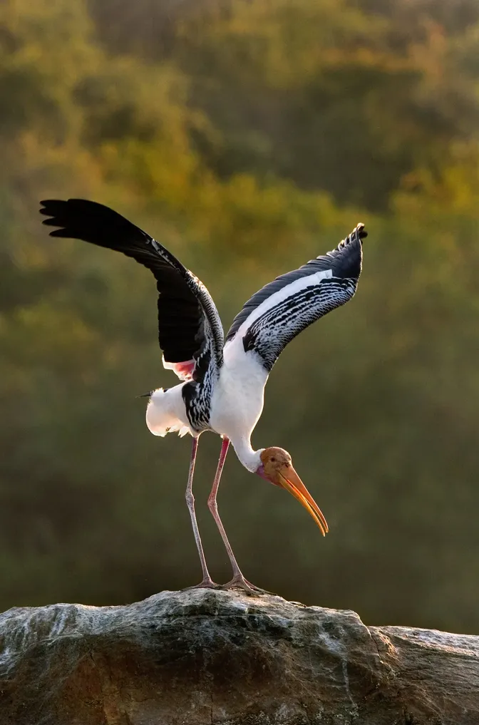 The Painted Stork is found in the wetlands of the Indian Subcontinent and extends into Southeast Asia. The distinctive pink tertial feathers of the adults give them their name. They forage in flocks in shallow waters along rivers or lakes. They immerse their half-open beaks in water and sweep them from side to side and snap up their prey of small fish that are sensed by touch. As they wade along they also stir the water with their feet to flush hiding fish.