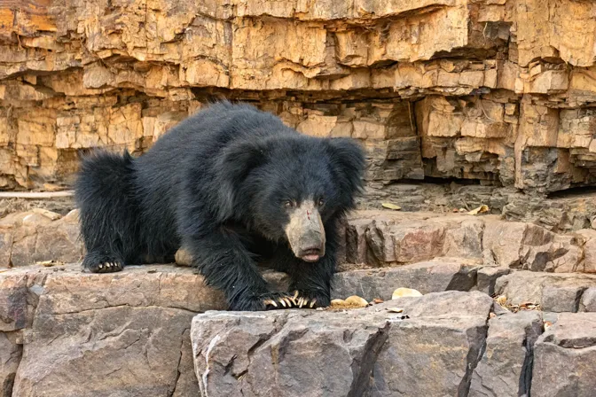 The Sloth Bear, also known as the Indian Bear, is native to the Indian subcontinent. It feeds on fruits, ants, and termites. It is listed as vulnerable on the IUCN Red List, mainly because of habitat loss and illegal poaching. It has also been called Labiated Bear because of its long lower lip and palate used for sucking up insects. The Sloth Bear has long, shaggy fur, a mane around the face, and long, sickle-shaped claws.