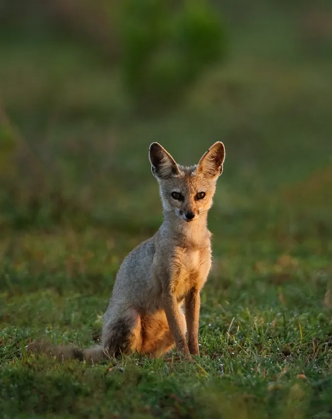 This photo of the Indian Fox was taken in Basur Kaval. As we entered the grassland, it started pouring very heavily and after waiting for about 45 minutes, the rains stopped and in the late evening when the sun was going down, this fox emerged and sat in brilliant light giving us a rare opportunity of taking his portrait.