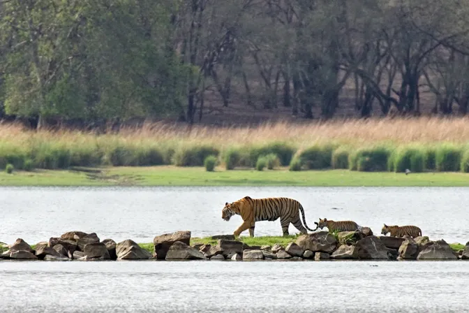 This image was taken in Ranthambhore National Park in June 2014. The tigress Krishna (T19) had littered, and she was taking her cubs for a stroll in her favourite section of her territory–the bridge on the lake. Tigresses do walk long distances within their territory guarding it and protecting the cubs from male tigers.