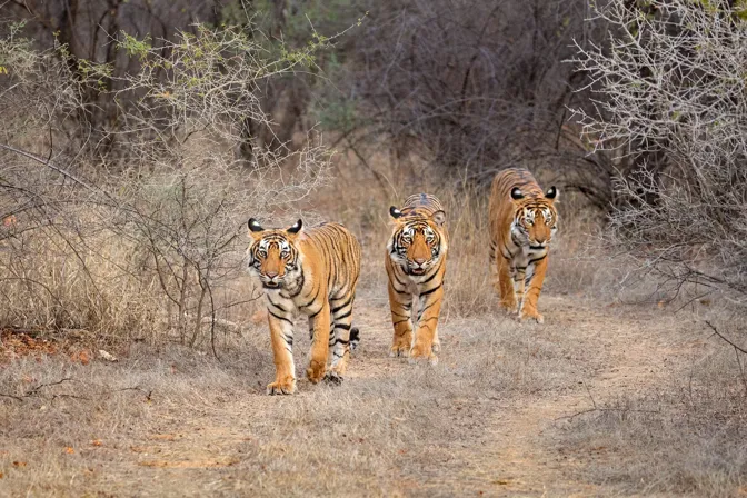These three adorable sub-adult cubs were photographed in Ranthambhore National Park in April 2017. They were marching very early in the morning along with their mother and father. The three cubs moved in one direction, while their parents moved in a slightly different direction. One of the cubs decided to show us who’s boss and came close to our jeep before all three of them changed direction to follow their parents back into the shrubs.