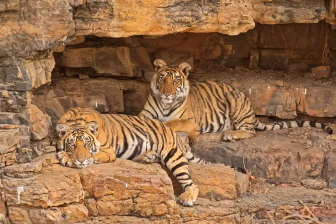 This image of the cubs of tigress Krishna relaxing in a cave was taken in May 2018 in Ranthambhore National Park. The mother and the cubs came to a waterhole in the morning and played in the water for a while. As the temperature started rising, they moved to a secluded area that had a cave with a water body just below it. Krishna and one of her cubs chose to cool off in the water while two of them moved into the cave for their afternoon siesta.
