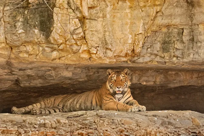 This image of a male tiger resting inside a cave was taken in May 2018 in Ranthambhore National Park. Since it can get really hot in May, the tiger had been sitting in a waterhole for the better part of the day. In the afternoon, he got up and entered this cave to get some respite from the sun. Later in the evening, he emerged from the cave to quench his thirst before disappearing into the jungle.