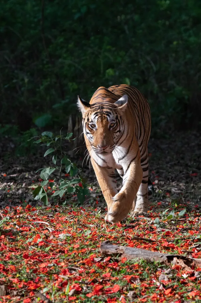 This image was also captured in May 2019 when this tigress emerged from the forest and started walking on a carpet of fallen red, Mayflower petals. The moment she walked on the flower carpet led to this stunning image of this beautiful tigress in brilliant lighting.