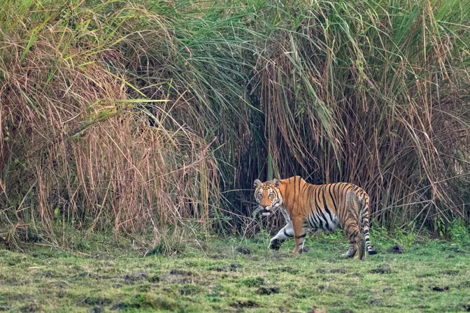 This image of the tigress was captured in Kaziranga National Park in February 2017. It is extremely difficult to sight and photograph a tiger in Kaziranga due to the presence of tall elephant grass. On this eventful day, during an evening safari, alarm calls of deer were heard. Moving in that direction, I realized that a tigress was crossing the road and heading towards tall grass. I followed the tiger and, after a long and patient wait, was rewarded with the lovely sight of the powerful tigress emerging from the tall grass for a few seconds before she went back inside.
