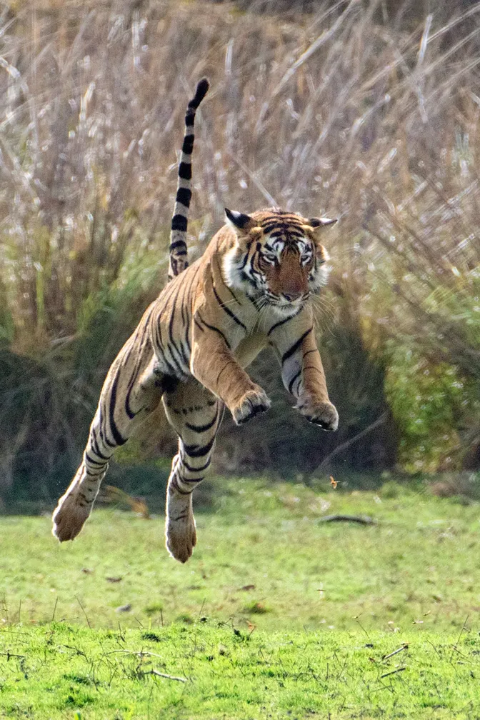 This image of a jumping tigress was captured in Ranthambhore National Park in April 2017. The tigress–Arrowhead–was separated from her suitor by a stream. Not wanting to get her paws wet, she crossed the stream in a single leap and met her mate. This photograph is the first frame of the entire leaping sequence.