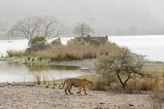 This male tiger was photographed in Ranthambhore National Park in 2017. Since he was walking towards one of the many lakes that dot the national park, I wanted a picture that had him and the lake. With this in mind, we moved our jeep to a slightly elevated place and waited for him to walk into my frame. This picture shows the beautiful landscape of Ranthambhore.