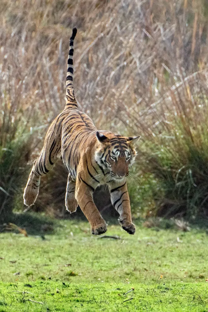 Arrowhead landing on this side of the stream. This image was captured in Ranthambhore National Park in April 2017. Like an uncoiled spring, she just took off and jumped across the stream without any effort.