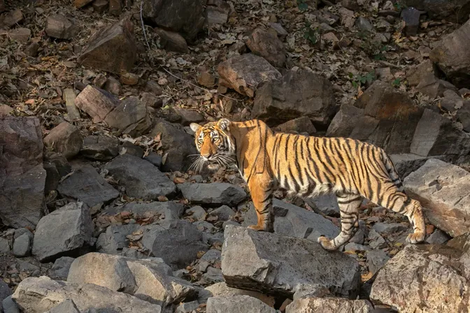 This photograph of a sub-adult tiger cub was taken in Ranthambhore National Park in 2017. The cub was marching through the forest with its mother and two siblings. The deer and langurs in the area were alarmed by the cubs' presence and were making alarm calls. This curious cub stood on a rock to see what the commotion was all about, just as the sun broke through the clouds and shone on the cub.
